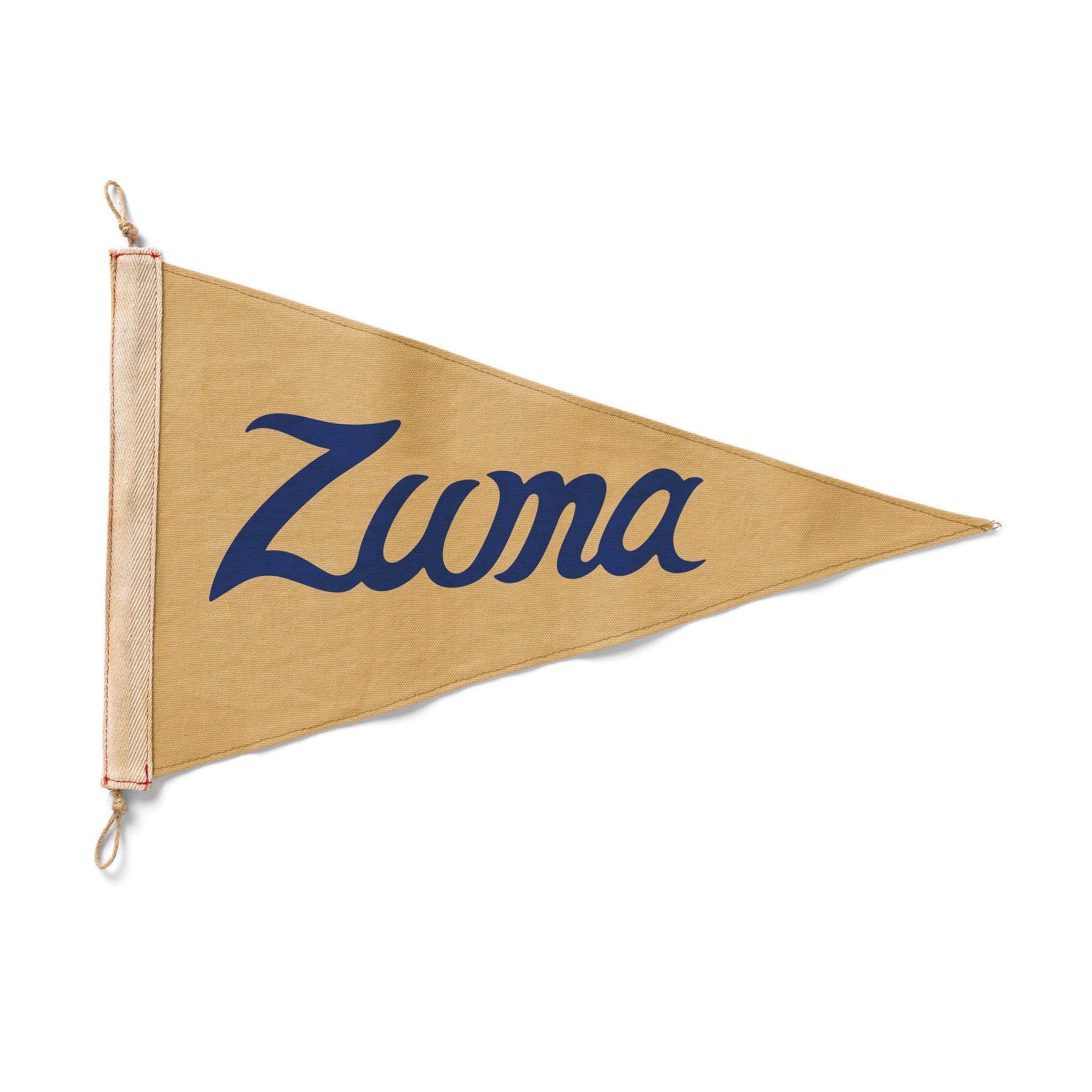 This hand-made flag uses a washed ochre colored duck canvas with a royal blue screen print. Each flag is topped with a natural twine + twill tape and stamped with Slightly Choppy branding.