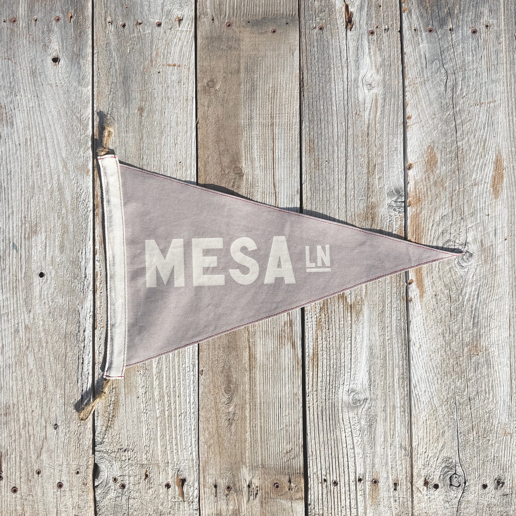 This hand-made flag uses a washed light grey canvas with off-white hand-screen print. Each flag is topped with a natural twine + twill tape and stamped with Slightly Choppy branding.