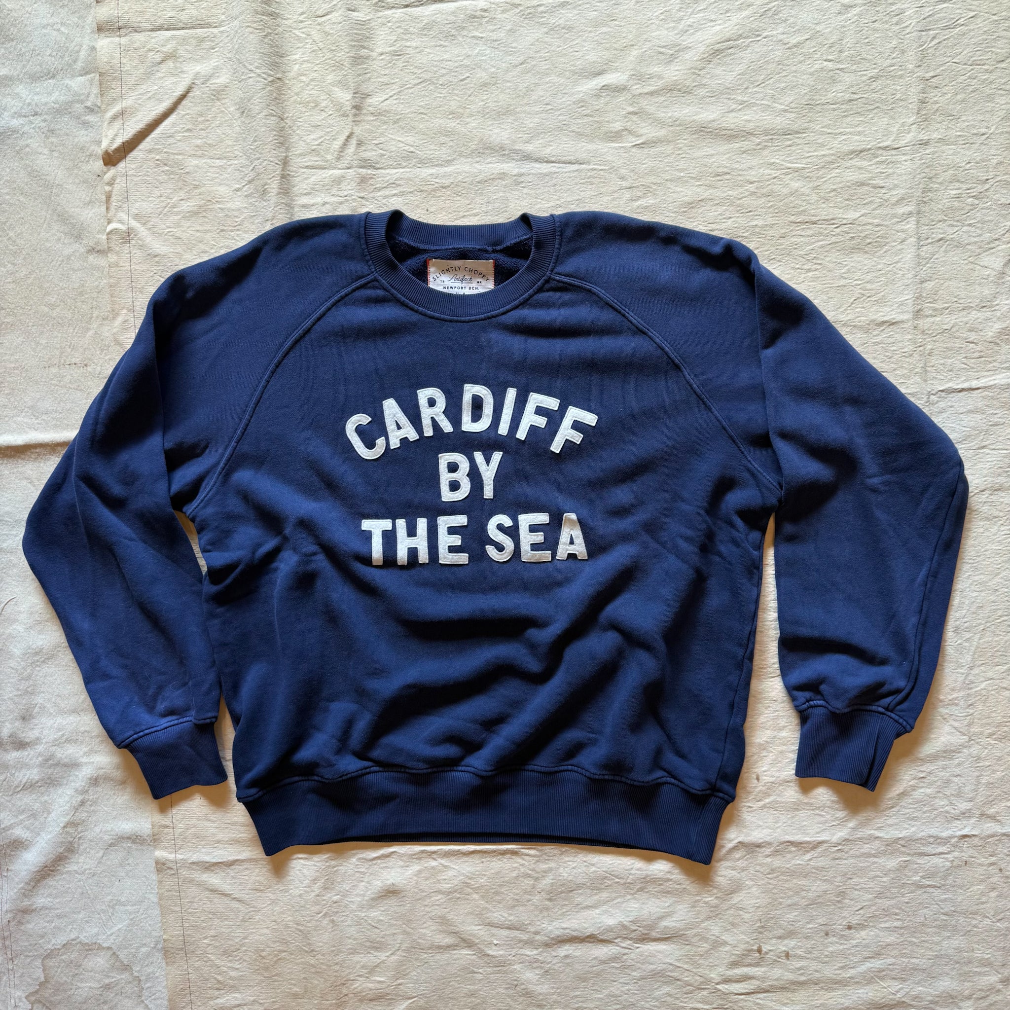 This is a newly developed, navy sweatshirt with off-white felt appliqué.